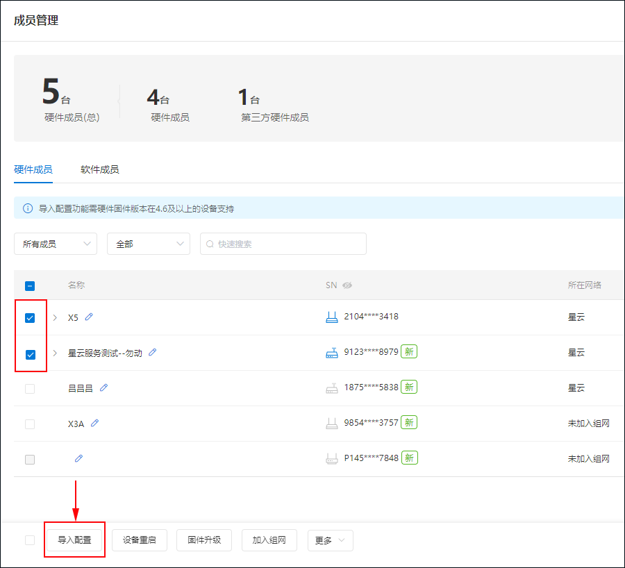 1.在【成员管理】-【成员列表】中勾选目标主机设备,点击【导入配置】进行配置设备。