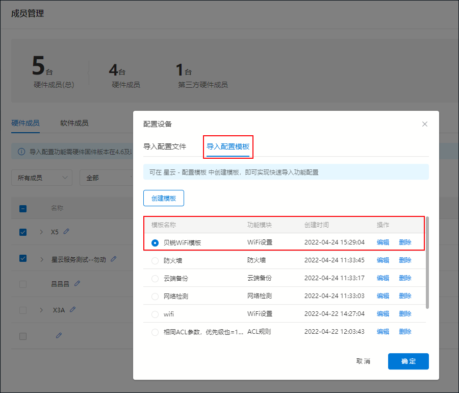 2.在配置设备的弹窗中,点击【导入配置模板】,选中需导入模板后点击确认,完成模板配置。
