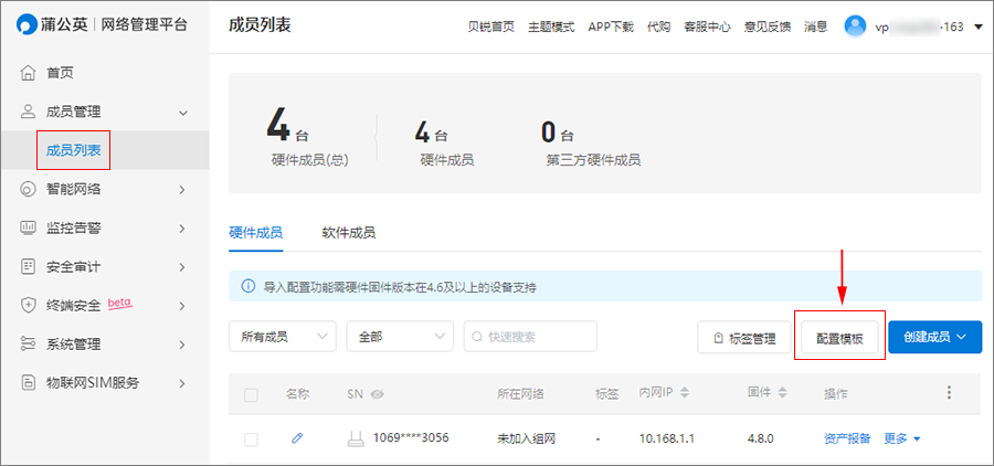 进入蒲公英管理平台的【成员管理】服务,点击【成员列表】模块的【配置模板】,进行创建配置模板界面。